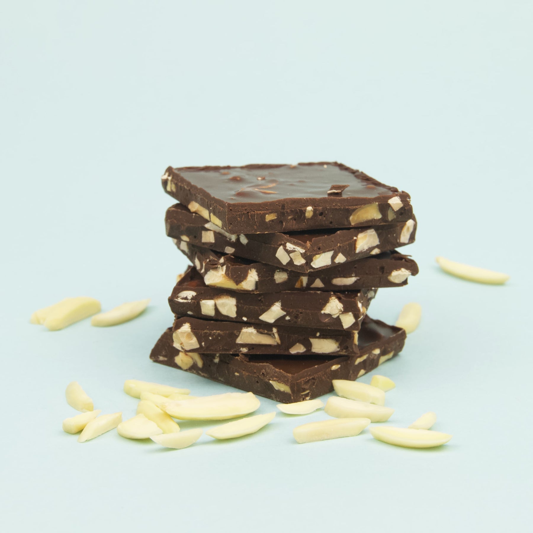 Australian slivered almonds encased in the finest 63% dark chocolate, transformed into crunchy bits.